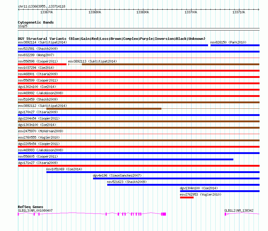 | | Variant Type | CNV loss | | Copy Number | | | Allele State | | | Allele Origin | | | Probe Count | | | Validation Flag | | | Merged Status | M | | Merged Variants | dgv2205n54 | | Supporting Variants | nssv1176211 | | Samples | NINDS_26 | | Known Genes | GLB1L2, GLB1L3 | | Method | SNP array | | Analysis | Illumina SNP array copy number analysis | | Platform | Not reported | | Comments | | | Reference | Cooper_et_al_2011 | | Pubmed ID | 21841781 | | Accession Number(s) | nsv556606