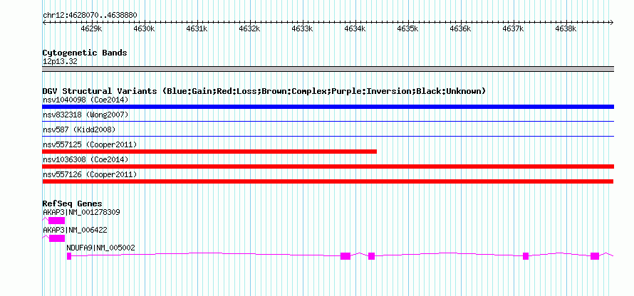 Variant DetailsVariant: nsv557126| Internal ID | 16344535 | | Landmark | | | Location Information | | | Cytoband | 12p13.32 | | Allele length | | Assembly | Allele length | | hg38 | 10811 | | hg19 | 10811 | | hg18 | 10811 |