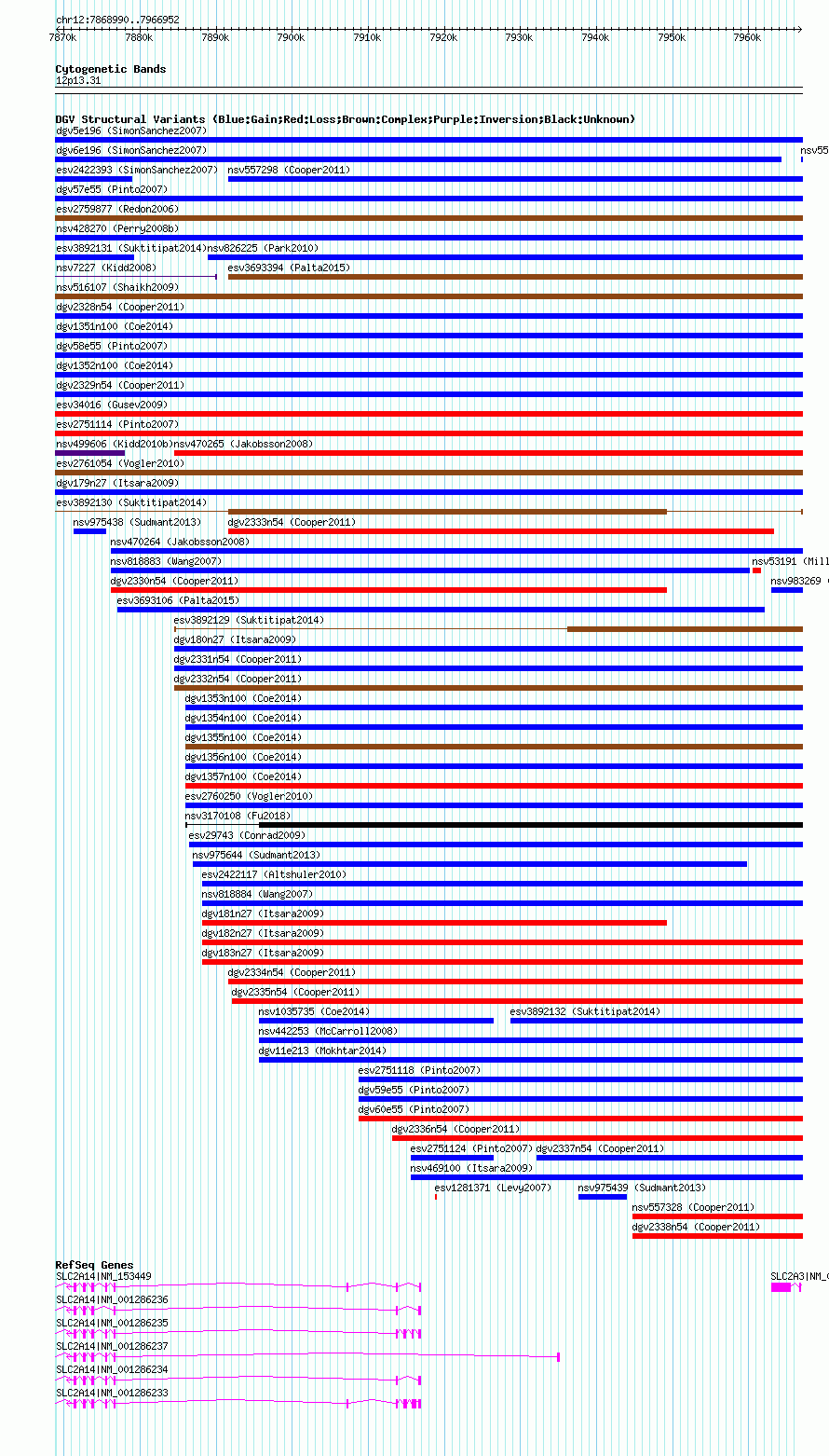 Variant DetailsVariant: nsv557279| Internal ID | 16344688 | | Landmark | | | Location Information | | | Cytoband | 12p13.31 | | Allele length | | Assembly | Allele length | | hg38 | 97963 | | hg19 | 97963 | | hg18 | 97963 |