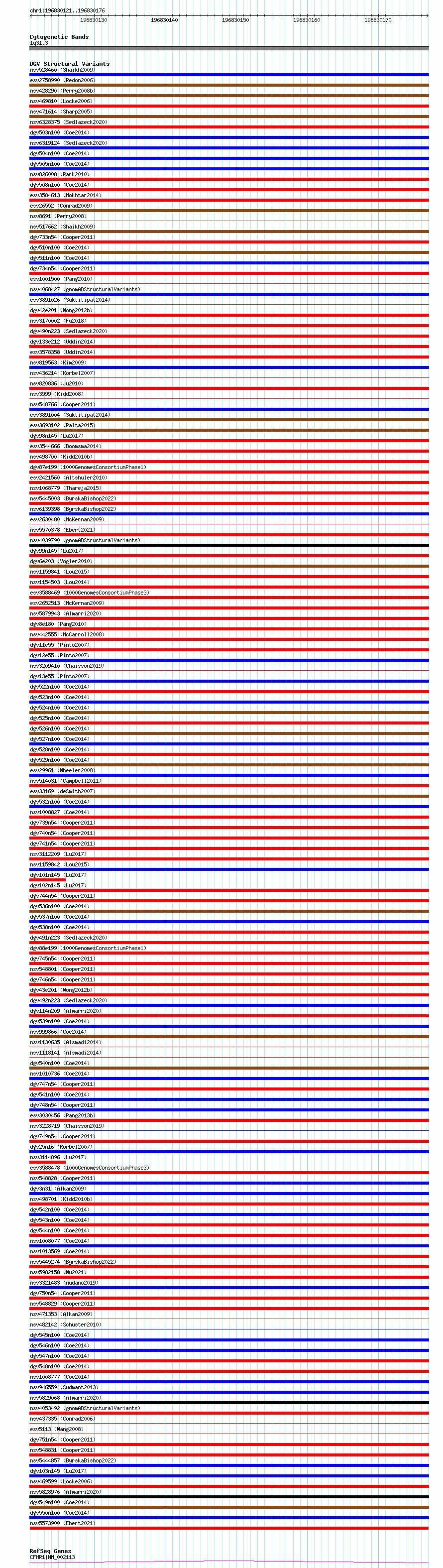 Variant DetailsVariant: nsv5573900| Internal ID | 21522309 | | Landmark | | | Location Information | | | Cytoband | 1q31.3 | | Allele length | | Assembly | Allele length | | hg38 | 56 | | hg19 | 56 |