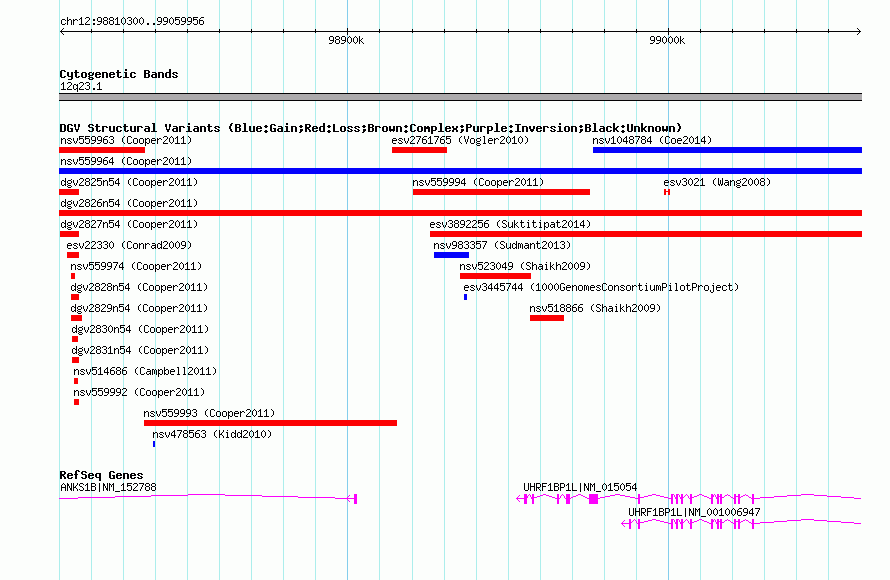 | Variant Type | CNV loss | Copy Number | | Allele State | | Allele Origin | | Probe Count | | Validation Flag | | Merged Status | M | Merged Variants | dgv2826n54 | Supporting Variants | nssv801490 | Samples | | Known Genes | ANKS1B, UHRF1BP1L | Method | SNP array | Analysis | Illumina SNP array copy number analysis | Platform | Not reported | Comments | | Reference | Cooper_et_al_2011 | Pubmed ID | 21841781 | Accession Number(s) | nsv559970