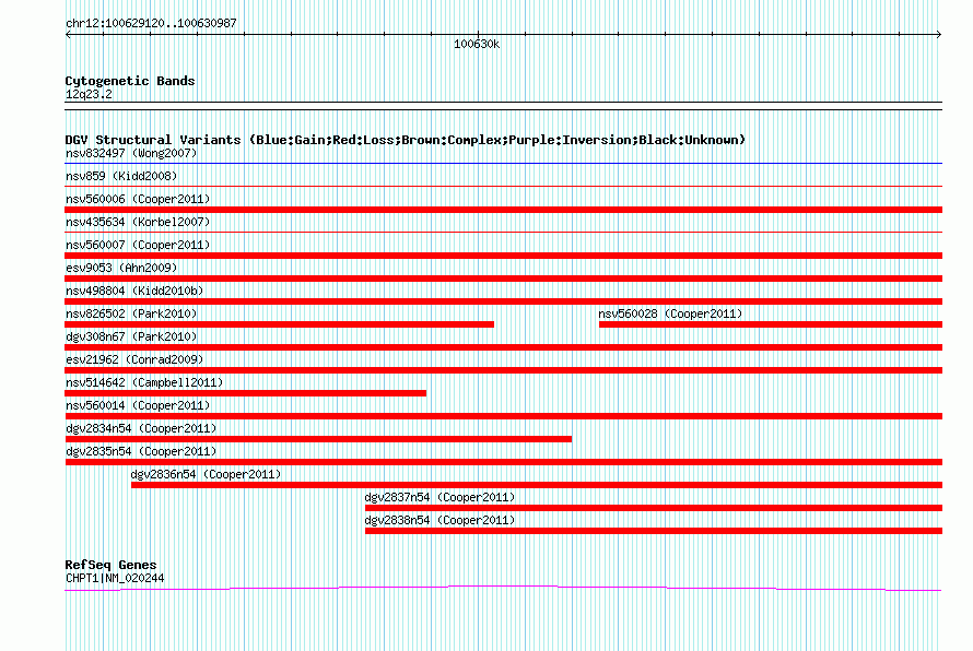 Variant DetailsVariant: nsv560011| Internal ID | 16347420 | | Landmark | | | Location Information | | | Cytoband | 12q23.2 | | Allele length | | Assembly | Allele length | | hg38 | 1868 | | hg19 | 1868 | | hg18 | 1868 |