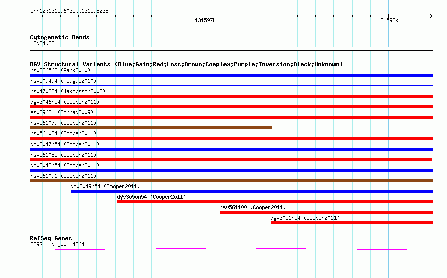 | | Variant Type | CNV gain | | Copy Number | | | Allele State | | | Allele Origin | | | Probe Count | | | Validation Flag | | | Merged Status | M | | Merged Variants | dgv3048n54 | | Supporting Variants | nssv805890, nssv805891 | | Samples | | | Known Genes | FBRSL1 | | Method | SNP array | | Analysis | Illumina SNP array copy number analysis | | Platform | Not reported | | Comments | | | Reference | Cooper_et_al_2011 | | Pubmed ID | 21841781 | | Accession Number(s) | nsv561090