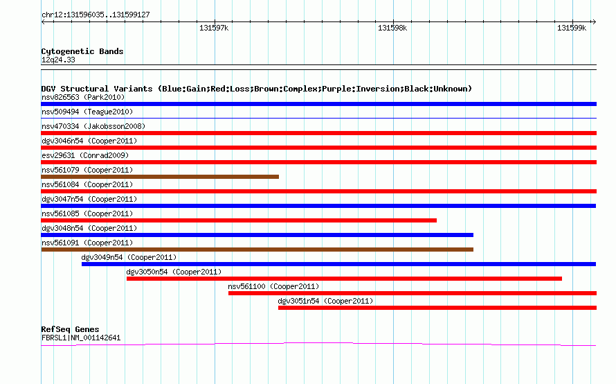 | | Variant Type | CNV gain | | Copy Number | | | Allele State | | | Allele Origin | | | Probe Count | | | Validation Flag | | | Merged Status | M | | Merged Variants | dgv3047n54 | | Supporting Variants | nssv805896, nssv805897 | | Samples | | | Known Genes | FBRSL1 | | Method | SNP array | | Analysis | Illumina SNP array copy number analysis | | Platform | Not reported | | Comments | | | Reference | Cooper_et_al_2011 | | Pubmed ID | 21841781 | | Accession Number(s) | nsv561093