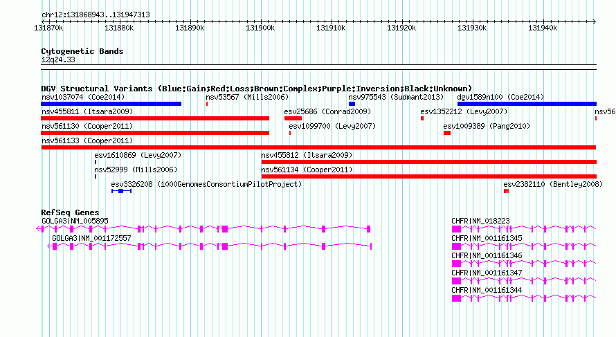| Variant Type | CNV loss | Copy Number | | Allele State | | Allele Origin | | Probe Count | | Validation Flag | | Merged Status | M | Merged Variants | | Supporting Variants | nssv805951 | Samples | | Known Genes | CHFR, GOLGA3 | Method | SNP array | Analysis | Illumina SNP array copy number analysis | Platform | Not reported | Comments | | Reference | Cooper_et_al_2011 | Pubmed ID | 21841781 | Accession Number(s) | nsv561133