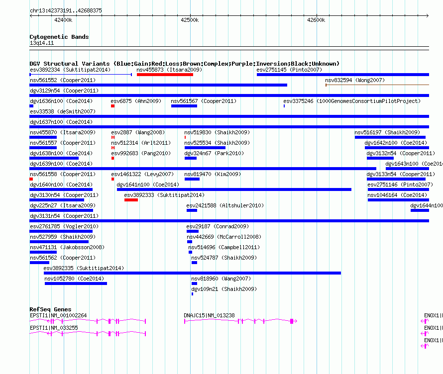 Variant DetailsVariant: nsv561564| Internal ID | 16002287 | | Landmark | | | Location Information | | | Cytoband | 13q14.11 | | Allele length | | Assembly | Allele length | | hg38 | 315185 | | hg19 | 315185 | | hg18 | 315185 |