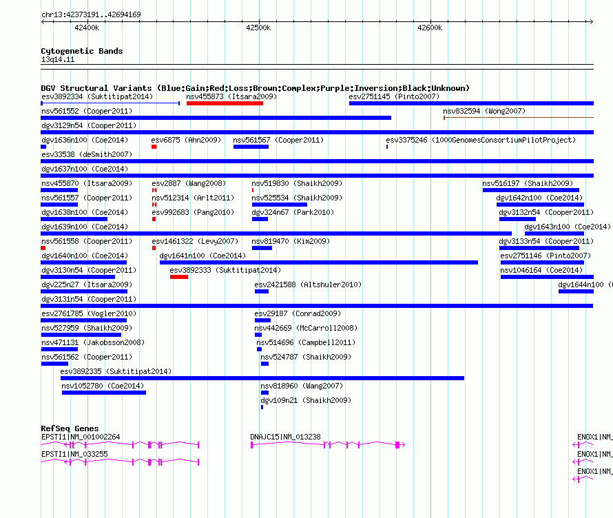 Variant DetailsVariant: nsv561565| Internal ID | 16002288 | | Landmark | | | Location Information | | | Cytoband | 13q14.11 | | Allele length | | Assembly | Allele length | | hg38 | 320979 | | hg19 | 320979 | | hg18 | 320979 |