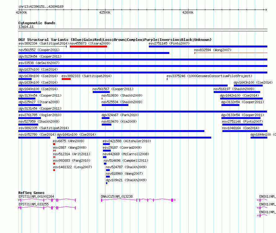 Variant DetailsVariant: nsv561566| Internal ID | 16002289 | | Landmark | | | Location Information | | | Cytoband | 13q14.11 | | Allele length | | Assembly | Allele length | | hg38 | 298019 | | hg19 | 298019 | | hg18 | 298019 |