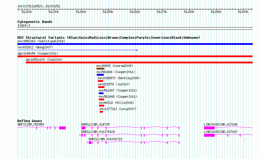 Variant DetailsVariant: nsv561645| Internal ID | 16002368 | | Landmark | | | Location Information | | | Cytoband | 13q14.3 | | Allele length | | Assembly | Allele length | | hg38 | 86730 | | hg19 | 86730 | | hg18 | 86730 |