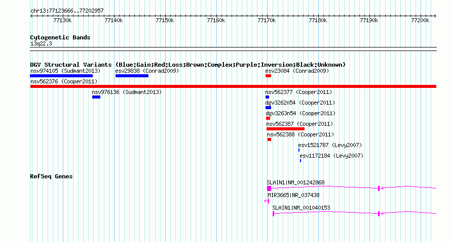 Variant DetailsVariant: nsv562376| Internal ID | 16349785 | | Landmark | | | Location Information | | | Cytoband | 13q22.3 | | Allele length | | Assembly | Allele length | | hg38 | 79292 | | hg19 | 79292 | | hg18 | 79292 |