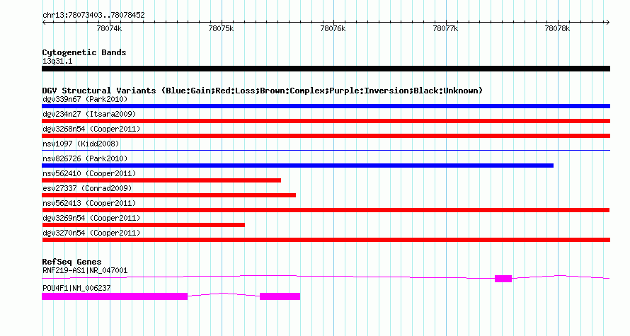 | | Variant Type | CNV loss | | Copy Number | | | Allele State | | | Allele Origin | | | Probe Count | | | Validation Flag | | | Merged Status | M | | Merged Variants | | | Supporting Variants | nssv815910, nssv815909 | | Samples | | | Known Genes | POU4F1, RNF219-AS1 | | Method | SNP array | | Analysis | Illumina SNP array copy number analysis | | Platform | Not reported | | Comments | | | Reference | Cooper_et_al_2011 | | Pubmed ID | 21841781 | | Accession Number(s) | nsv562413