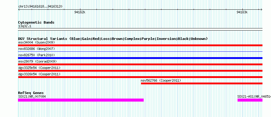 | | Variant Type | CNV loss | | Copy Number | | | Allele State | | | Allele Origin | | | Probe Count | | | Validation Flag | | | Merged Status | M | | Merged Variants | dgv3325n54 | | Supporting Variants | nssv817527 | | Samples | | | Known Genes | SOX21, SOX21-AS1 | | Method | SNP array | | Analysis | Illumina SNP array copy number analysis | | Platform | Not reported | | Comments | | | Reference | Cooper_et_al_2011 | | Pubmed ID | 21841781 | | Accession Number(s) | nsv562760