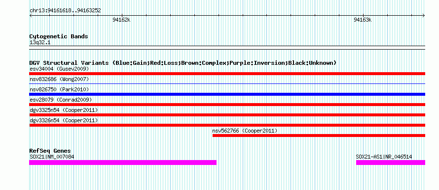 | | Variant Type | CNV loss | | Copy Number | | | Allele State | | | Allele Origin | | | Probe Count | | | Validation Flag | | | Merged Status | M | | Merged Variants | dgv3325n54 | | Supporting Variants | nssv817528 | | Samples | | | Known Genes | SOX21, SOX21-AS1 | | Method | SNP array | | Analysis | Illumina SNP array copy number analysis | | Platform | Not reported | | Comments | | | Reference | Cooper_et_al_2011 | | Pubmed ID | 21841781 | | Accession Number(s) | nsv562761