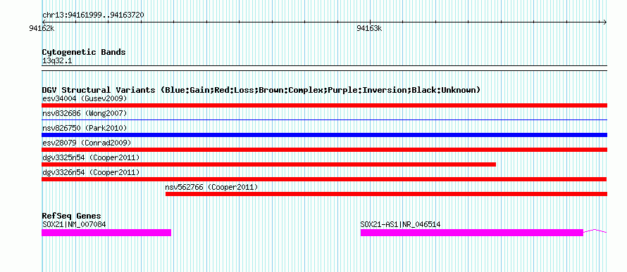 | | Variant Type | CNV loss | | Copy Number | | | Allele State | | | Allele Origin | | | Probe Count | | | Validation Flag | | | Merged Status | M | | Merged Variants | dgv3326n54 | | Supporting Variants | nssv817532 | | Samples | | | Known Genes | SOX21, SOX21-AS1 | | Method | SNP array | | Analysis | Illumina SNP array copy number analysis | | Platform | Not reported | | Comments | | | Reference | Cooper_et_al_2011 | | Pubmed ID | 21841781 | | Accession Number(s) | nsv562765