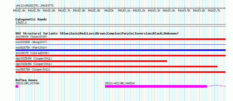| | Variant Type | CNV loss | | Copy Number | | | Allele State | | | Allele Origin | | | Probe Count | | | Validation Flag | | | Merged Status | M | | Merged Variants | | | Supporting Variants | nssv817533 | | Samples | | | Known Genes | SOX21, SOX21-AS1 | | Method | SNP array | | Analysis | Illumina SNP array copy number analysis | | Platform | Not reported | | Comments | | | Reference | Cooper_et_al_2011 | | Pubmed ID | 21841781 | | Accession Number(s) | nsv562766