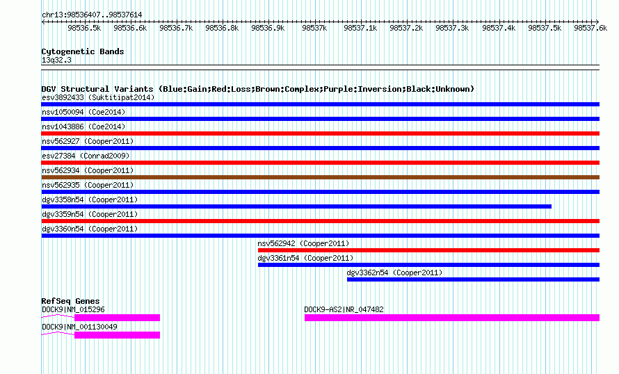 | | Variant Type | CNV loss | | Copy Number | | | Allele State | | | Allele Origin | | | Probe Count | | | Validation Flag | | | Merged Status | M | | Merged Variants | dgv3359n54 | | Supporting Variants | nssv818087 | | Samples | | | Known Genes | DOCK9, DOCK9-AS2 | | Method | SNP array | | Analysis | Illumina SNP array copy number analysis | | Platform | Not reported | | Comments | | | Reference | Cooper_et_al_2011 | | Pubmed ID | 21841781 | | Accession Number(s) | nsv562930