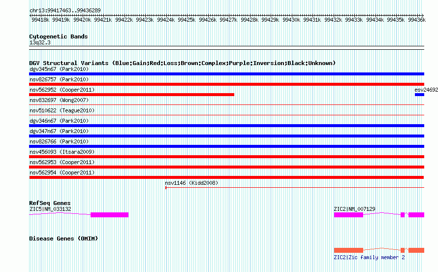 | | Variant Type | CNV loss | | Copy Number | | | Allele State | | | Allele Origin | | | Probe Count | | | Validation Flag | | | Merged Status | M | | Merged Variants | | | Supporting Variants | nssv818128 | | Samples | | | Known Genes | ZIC2, ZIC5 | | Method | SNP array | | Analysis | Illumina SNP array copy number analysis | | Platform | Not reported | | Comments | | | Reference | Cooper_et_al_2011 | | Pubmed ID | 21841781 | | Accession Number(s) | nsv562954