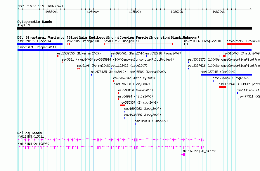 Variant DetailsVariant: nsv563071| Internal ID | 16350480 | | Landmark | | | Location Information | | | Cytoband | 13q33.3 | | Allele length | | Assembly | Allele length | | hg38 | 559633 | | hg19 | 559633 | | hg18 | 559633 |