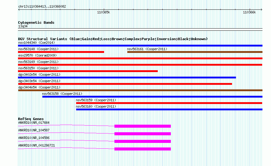 | | Variant Type | CNV gain+loss | | Copy Number | | | Allele State | | | Allele Origin | | | Probe Count | | | Validation Flag | | | Merged Status | M | | Merged Variants | dgv3404n54 | | Supporting Variants | nssv819901, nssv819900 | | Samples | | | Known Genes | ANKRD10 | | Method | SNP array | | Analysis | Illumina SNP array copy number analysis | | Platform | Not reported | | Comments | | | Reference | Cooper_et_al_2011 | | Pubmed ID | 21841781 | | Accession Number(s) | nsv563154