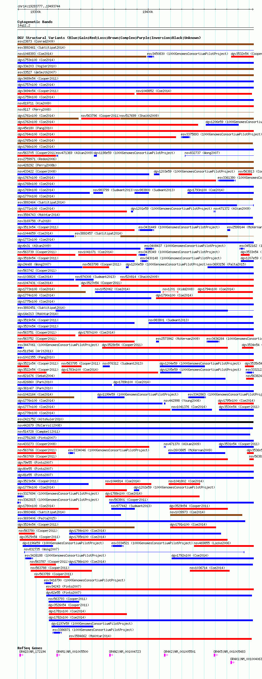 Variant DetailsVariant: nsv563776| Internal ID | 16351185 | | Landmark | | | Location Information | | | Cytoband | 14q11.2 | | Allele length | | Assembly | Allele length | | hg38 | 209968 | | hg19 | 209968 | | hg18 | 209968 |