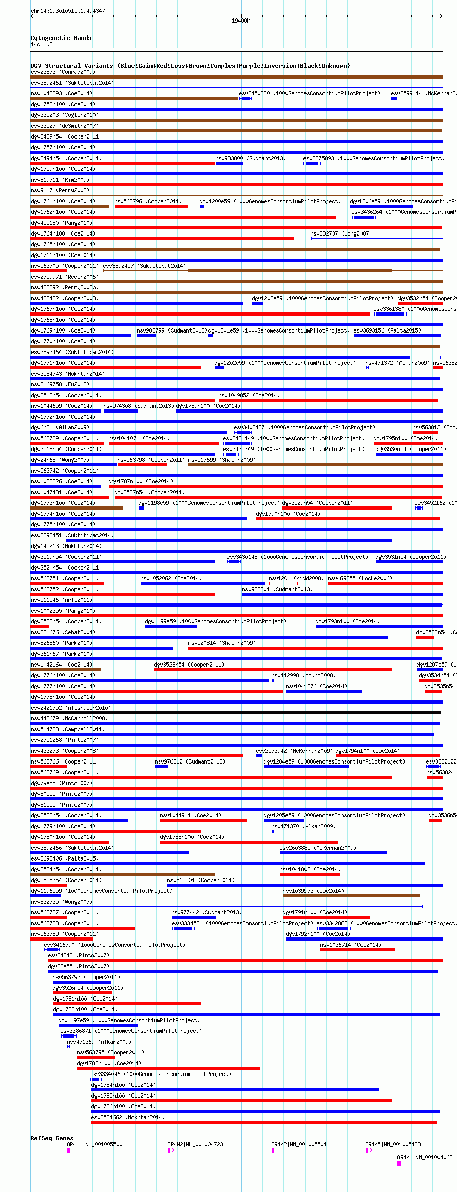 Variant DetailsVariant: nsv563790| Internal ID | 16351199 | | Landmark | | | Location Information | | | Cytoband | 14q11.2 | | Allele length | | Assembly | Allele length | | hg38 | 193297 | | hg19 | 193297 | | hg18 | 193297 |