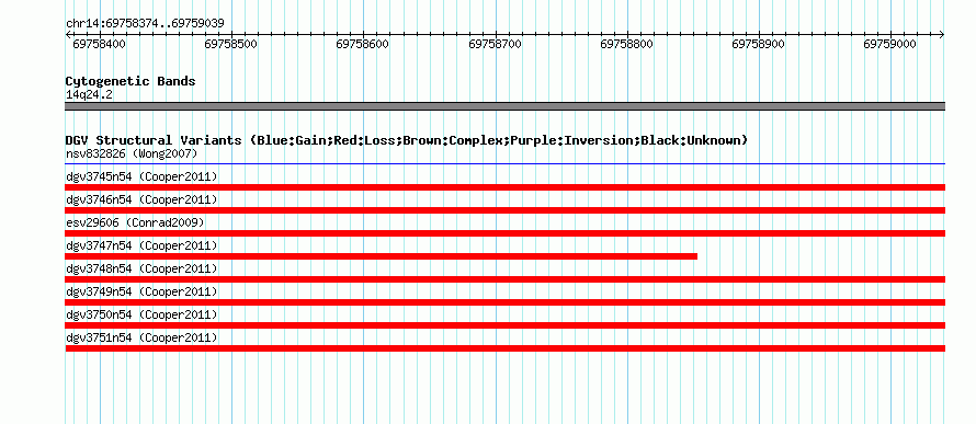 Variant DetailsVariant: nsv565038| Internal ID | 16352447 | | Landmark | | | Location Information | | | Cytoband | 14q24.2 | | Allele length | | Assembly | Allele length | | hg38 | 666 | | hg19 | 666 | | hg18 | 666 |