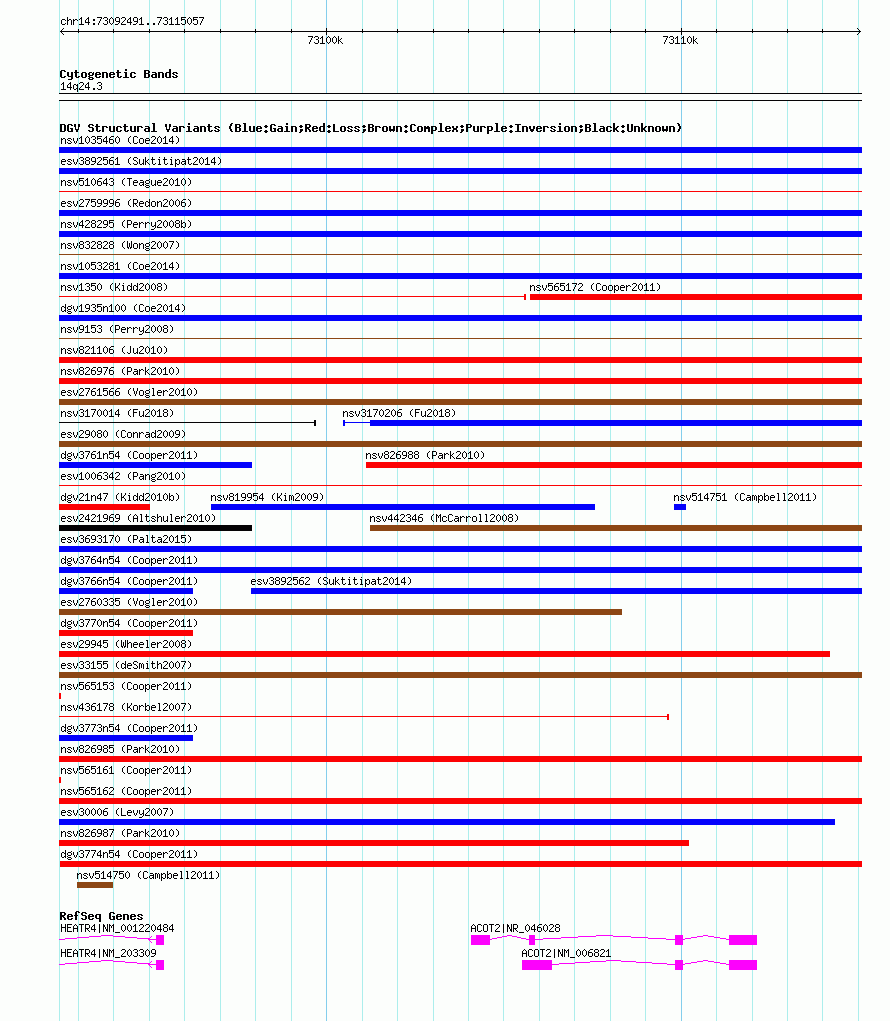 | | Variant Type | CNV loss | | Copy Number | | | Allele State | | | Allele Origin | | | Probe Count | | | Validation Flag | | | Merged Status | M | | Merged Variants | dgv3774n54 | | Supporting Variants | nssv829483 | | Samples | | | Known Genes | ACOT2, HEATR4 | | Method | SNP array | | Analysis | Illumina SNP array copy number analysis | | Platform | Not reported | | Comments | | | Reference | Cooper_et_al_2011 | | Pubmed ID | 21841781 | | Accession Number(s) | nsv565163