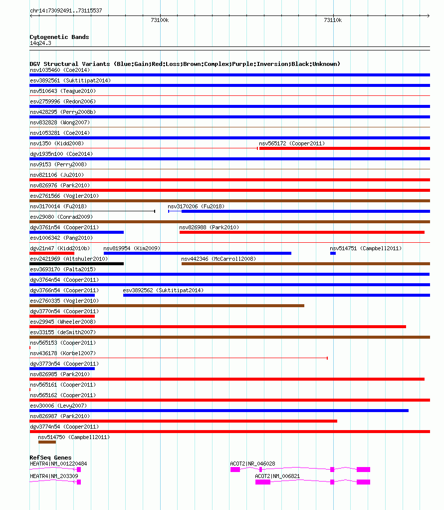 | | Variant Type | CNV loss | | Copy Number | | | Allele State | | | Allele Origin | | | Probe Count | | | Validation Flag | | | Merged Status | M | | Merged Variants | dgv3774n54 | | Supporting Variants | nssv829484 | | Samples | | | Known Genes | ACOT2, HEATR4 | | Method | SNP array | | Analysis | Illumina SNP array copy number analysis | | Platform | Not reported | | Comments | | | Reference | Cooper_et_al_2011 | | Pubmed ID | 21841781 | | Accession Number(s) | nsv565164