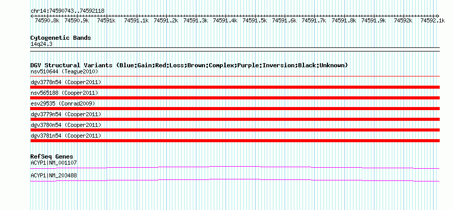 Variant DetailsVariant: nsv565190| Internal ID | 16352599 | | Landmark | | | Location Information | | | Cytoband | 14q24.3 | | Allele length | | Assembly | Allele length | | hg38 | 1376 | | hg19 | 1376 | | hg18 | 1376 |