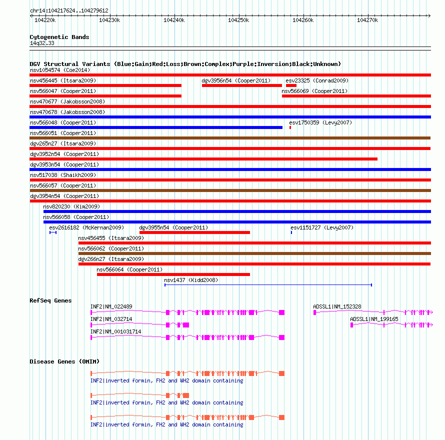 Variant DetailsVariant: nsv566055| Internal ID | 16353464 | | Landmark | | | Location Information | | | Cytoband | 14q32.33 | | Allele length | | Assembly | Allele length | | hg38 | 61989 | | hg19 | 61989 | | hg18 | 61989 |