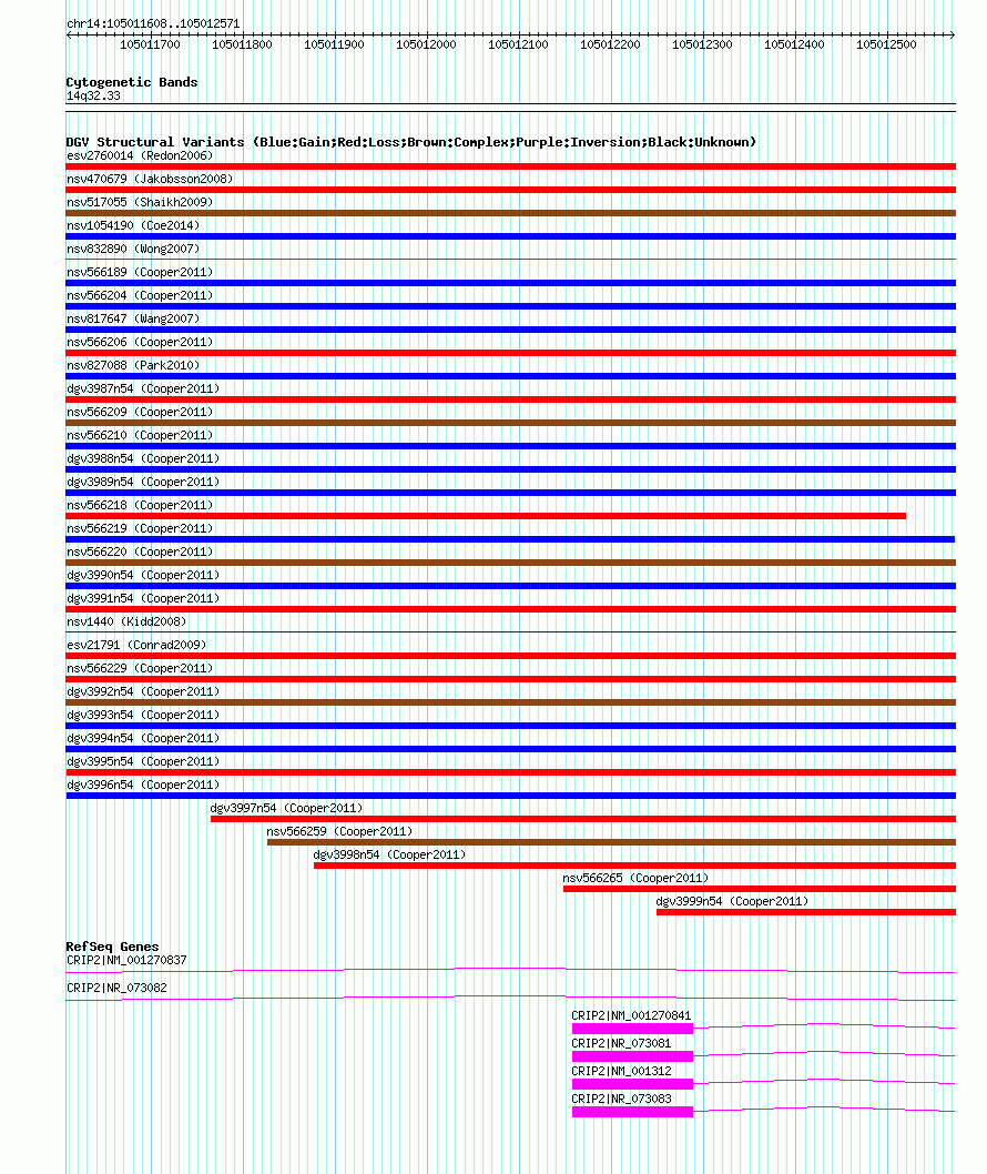 | | Variant Type | CNV gain+loss | | Copy Number | | | Allele State | | | Allele Origin | | | Probe Count | | | Validation Flag | | | Merged Status | M | | Merged Variants | dgv3992n54 | | Supporting Variants | nssv834864, nssv834868, nssv834871, nssv834867, nssv834869, nssv834865, nssv834870, nssv834866 | | Samples | | | Known Genes | CRIP2 | | Method | SNP array | | Analysis | Illumina SNP array copy number analysis | | Platform | Not reported | | Comments | | | Reference | Cooper_et_al_2011 | | Pubmed ID | 21841781 | | Accession Number(s) | nsv566233
