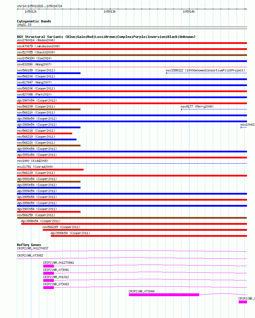 Variant DetailsVariant: nsv566259| Internal ID | 16353668 | | Landmark | | | Location Information | | | Cytoband | 14q32.33 | | Allele length | | Assembly | Allele length | | hg38 | 2899 | | hg19 | 2899 | | hg18 | 2899 |