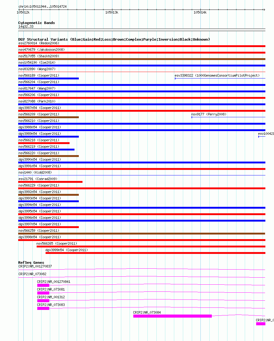 | | Variant Type | CNV gain | | Copy Number | | | Allele State | | | Allele Origin | | | Probe Count | | | Validation Flag | | | Merged Status | M | | Merged Variants | dgv3994n54 | | Supporting Variants | nssv834927, nssv834926 | | Samples | | | Known Genes | CRIP2 | | Method | SNP array | | Analysis | Illumina SNP array copy number analysis | | Platform | Not reported | | Comments | | | Reference | Cooper_et_al_2011 | | Pubmed ID | 21841781 | | Accession Number(s) | nsv566262