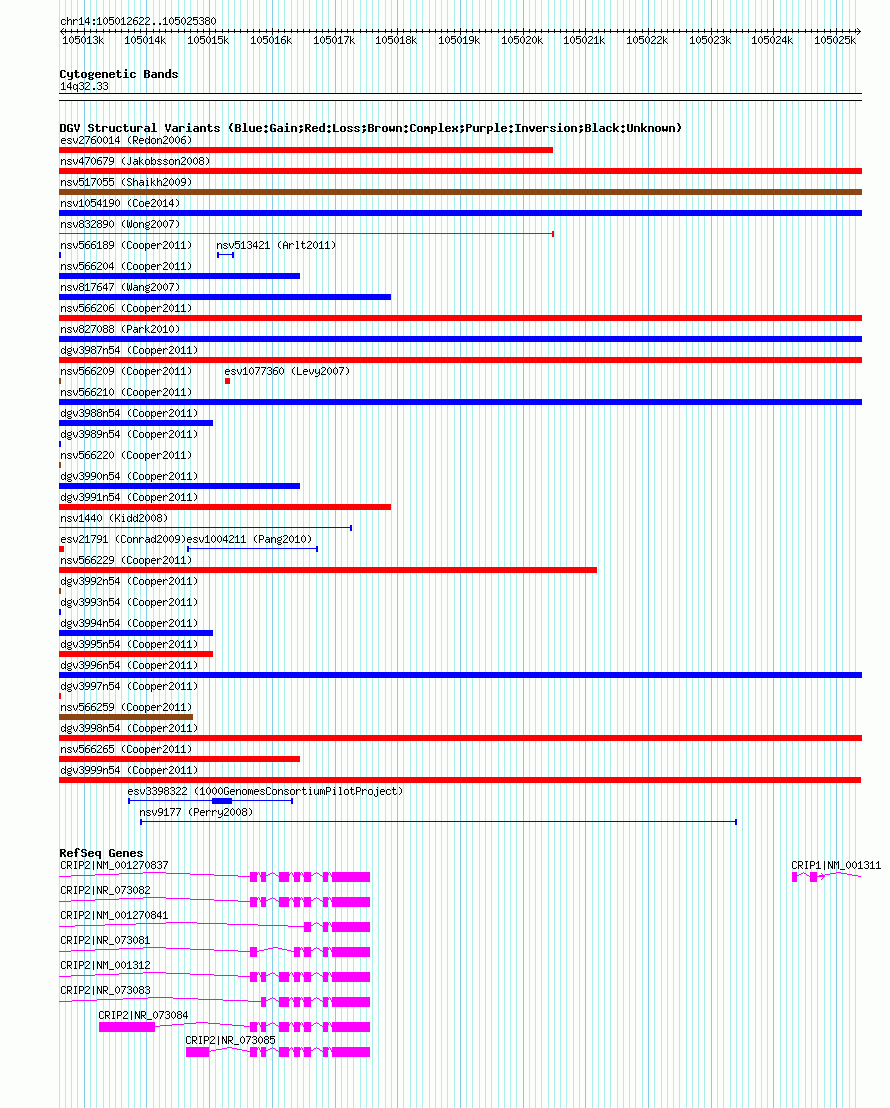 Variant DetailsVariant: nsv566268| Internal ID | 16353677 | | Landmark | | | Location Information | | | Cytoband | 14q32.33 | | Allele length | | Assembly | Allele length | | hg38 | 12759 | | hg19 | 12759 | | hg18 | 12759 |