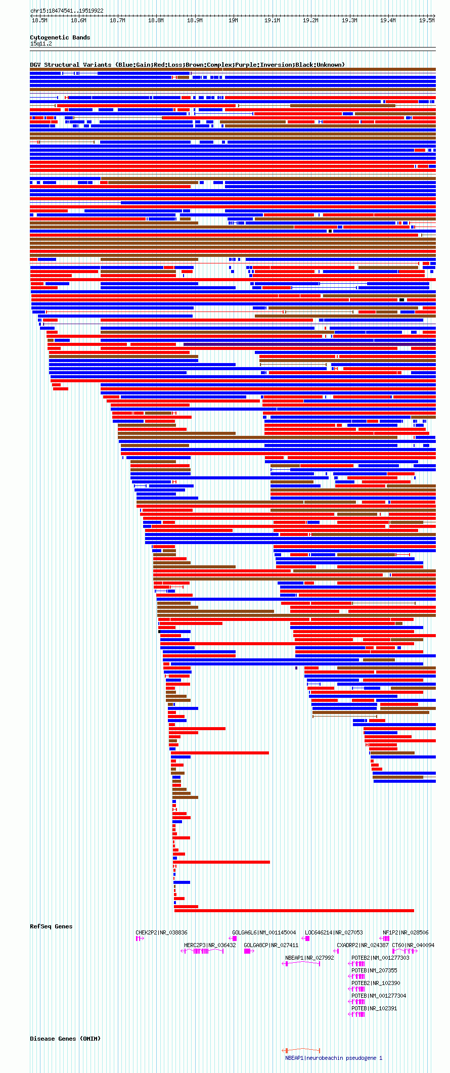 Variant DetailsVariant: nsv567146| Internal ID | 16354555 | | Landmark | | | Location Information | | | Cytoband | 15q11.1 | | Allele length | | Assembly | Allele length | | hg38 | 1040661 | | hg19 | 1040737 | | hg18 | 1045382 |
