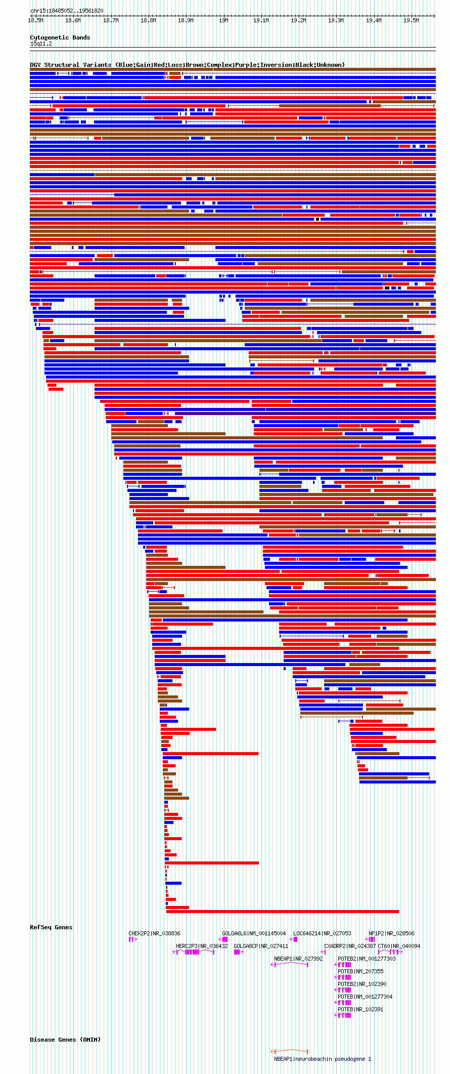 Variant DetailsVariant: nsv567158| Internal ID | 16354567 | | Landmark | | | Location Information | | | Cytoband | 15q11.1 | | Allele length | | Assembly | Allele length | | hg38 | 1072048 | | hg19 | 1072124 | | hg18 | 1076769 |