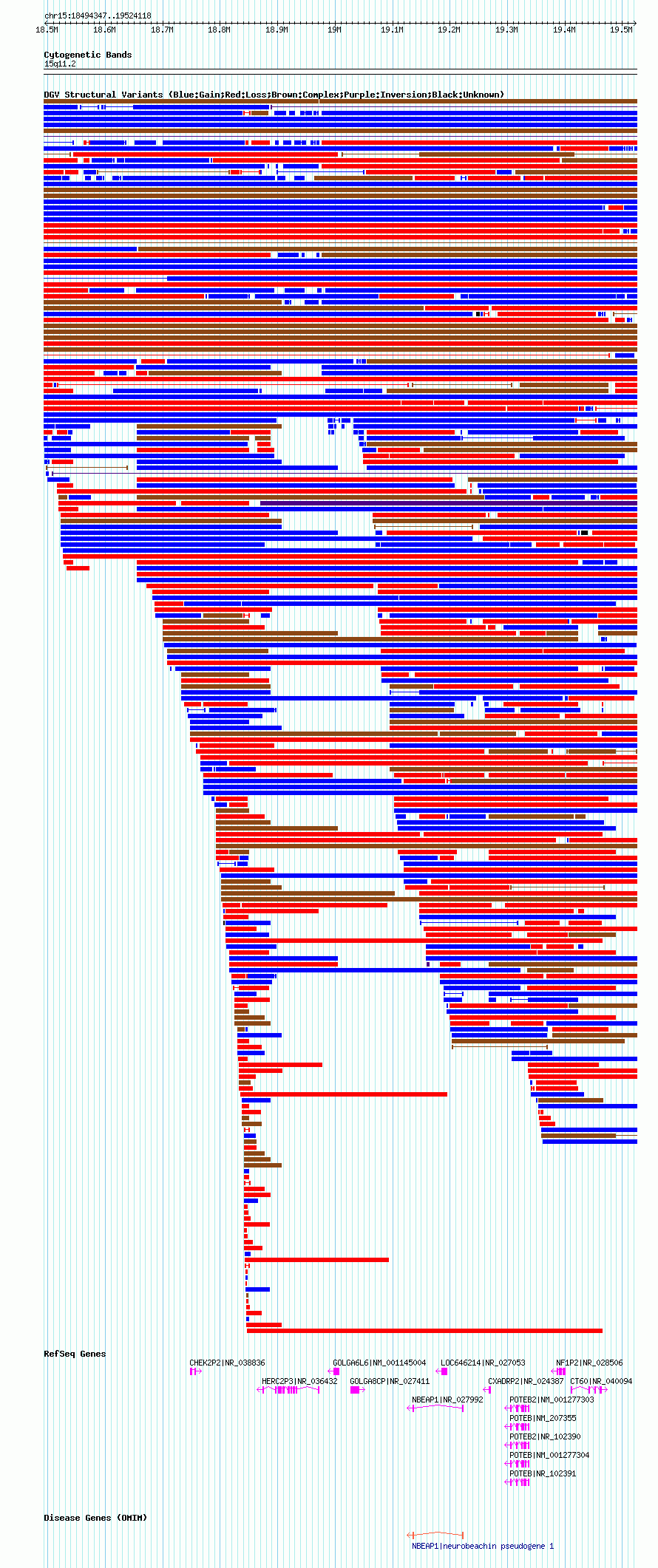 Variant DetailsVariant: nsv567168| Internal ID | 16354577 | | Landmark | | | Location Information | | | Cytoband | 15q11.1 | | Allele length | | Assembly | Allele length | | hg38 | 1025051 | | hg19 | 1025127 | | hg18 | 1029772 |