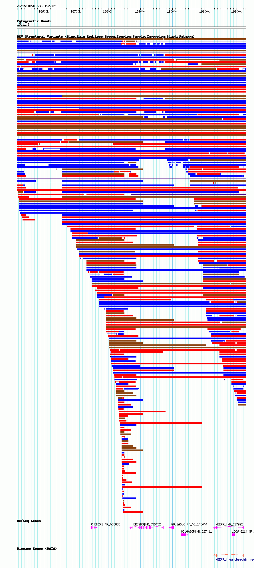 Variant DetailsVariant: nsv567189| Internal ID | 16354598 | | Landmark | | | Location Information | | | Cytoband | 15q11.1 | | Allele length | | Assembly | Allele length | | hg38 | 710402 | | hg19 | 710478 | | hg18 | 710496 |