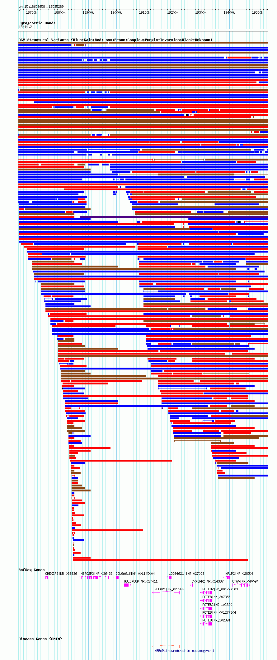 Variant DetailsVariant: nsv567239| Internal ID | 16354648 | | Landmark | | | Location Information | | | Cytoband | 15q11.1 | | Allele length | | Assembly | Allele length | | hg38 | 876911 | | hg19 | 876987 | | hg18 | 881632 |