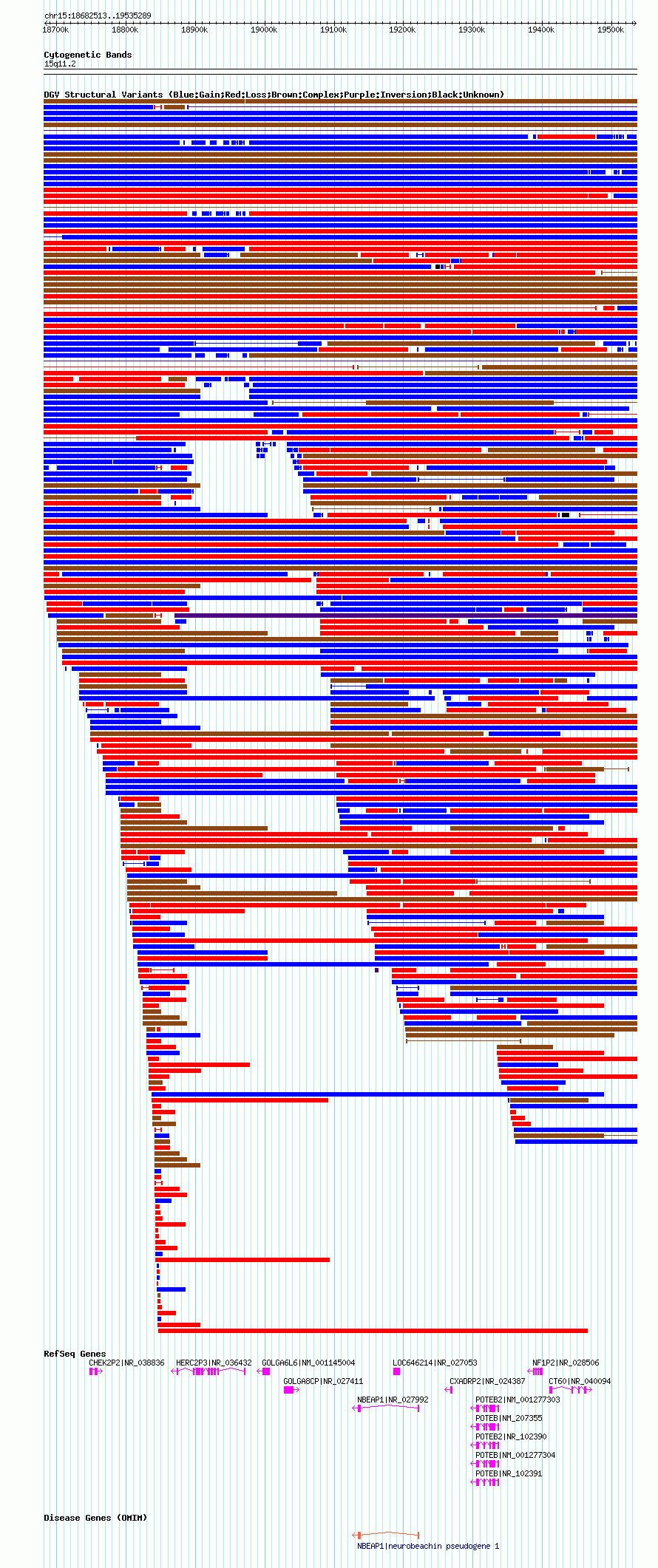 Variant DetailsVariant: nsv567290| Internal ID | 16354699 | | Landmark | | | Location Information | | | Cytoband | 15q11.1 | | Allele length | | Assembly | Allele length | | hg38 | 848056 | | hg19 | 848132 | | hg18 | 852777 |