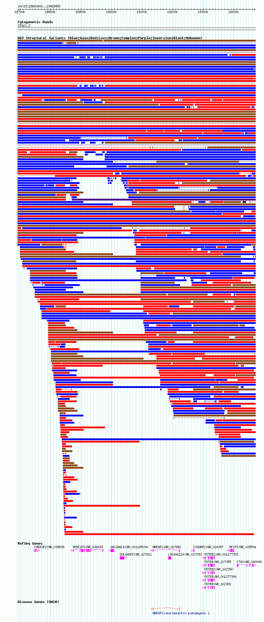 Variant DetailsVariant: nsv567299| Internal ID | 16354708 | | Landmark | | | Location Information | | | Cytoband | 15q11.1 | | Allele length | | Assembly | Allele length | | hg38 | 771787 | | hg19 | 771863 | | hg18 | 776508 |