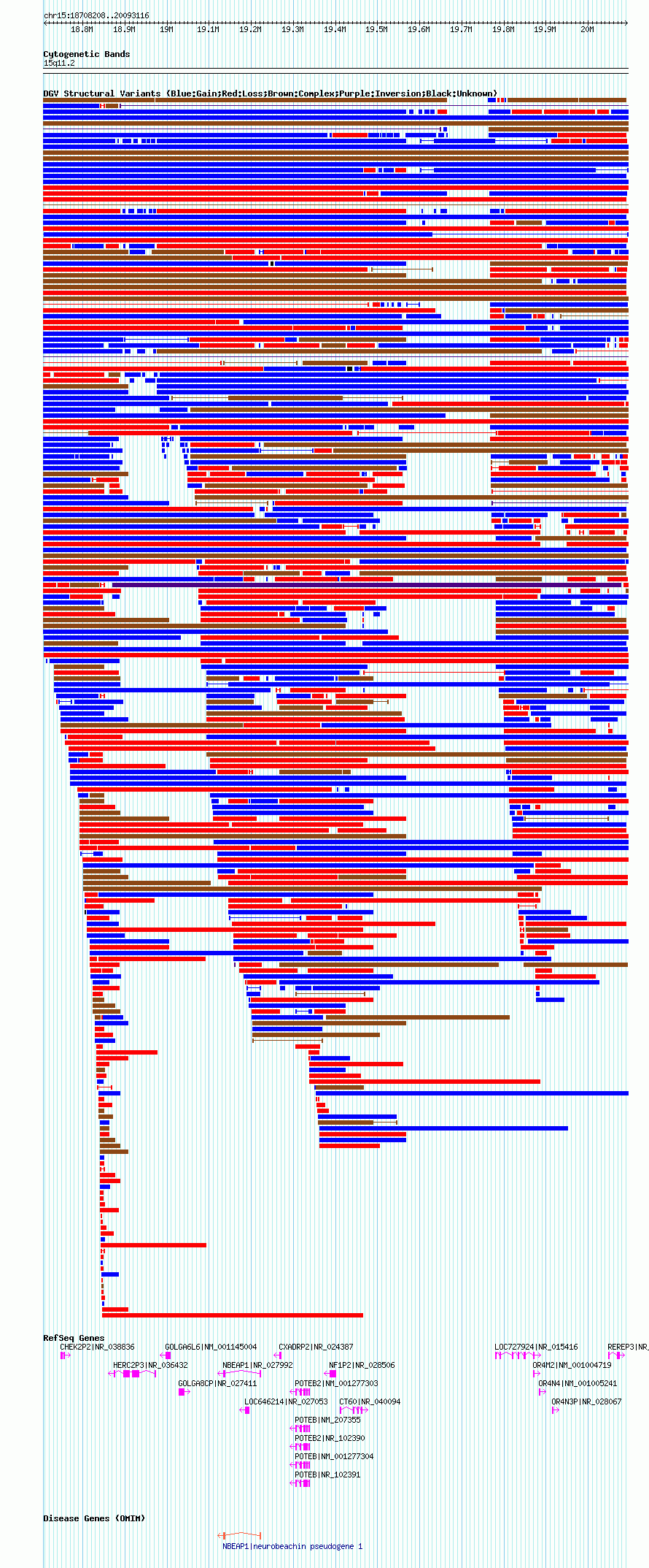 Variant DetailsVariant: nsv567312| Internal ID | 16354721 | | Landmark | | | Location Information | | | Cytoband | 15q11.1 | | Allele length | | Assembly | Allele length | | hg38 | 2060861 | | hg19 | 2143559 | | hg18 | 1384909 |