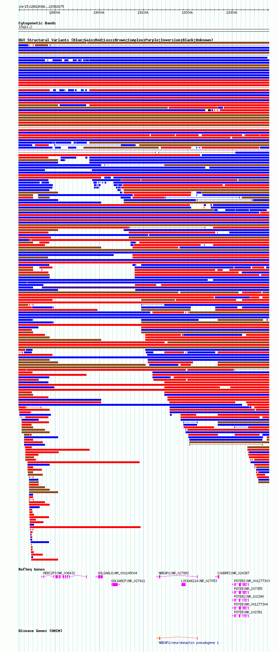 Variant DetailsVariant: nsv567338| Internal ID | 16354747 | | Landmark | | | Location Information | | | Cytoband | 15q11.1 | | Allele length | | Assembly | Allele length | | hg38 | 559903 | | hg19 | 559979 | | hg18 | 564590 |