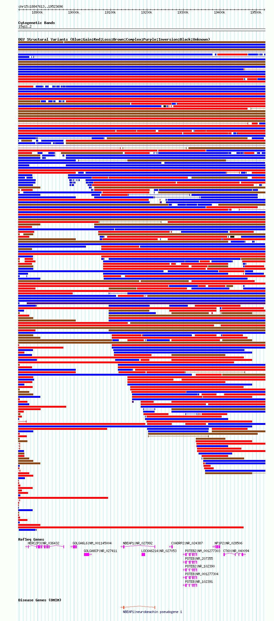 Variant DetailsVariant: nsv567438| Internal ID | 16354847 | | Landmark | | | Location Information | | | Cytoband | 15q11.1 | | Allele length | | Assembly | Allele length | | hg38 | 671363 | | hg19 | 671439 | | hg18 | 676084 |