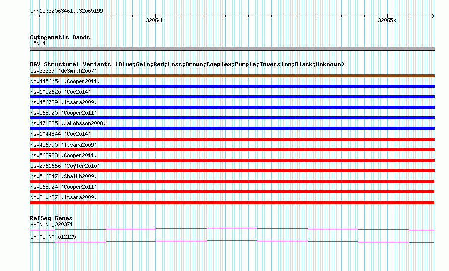 Variant DetailsVariant: nsv568924| Internal ID | 16356333 | | Landmark | | | Location Information | | | Cytoband | 15q14 | | Allele length | | Assembly | Allele length | | hg38 | 1739 | | hg19 | 1739 | | hg18 | 1739 |