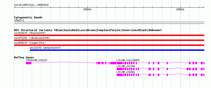| | Variant Type | CNV loss | | Copy Number | | | Allele State | | | Allele Origin | | | Probe Count | | | Validation Flag | | | Merged Status | M | | Merged Variants | | | Supporting Variants | nssv842224 | | Samples | | | Known Genes | ITPKA, LTK | | Method | SNP array | | Analysis | Illumina SNP array copy number analysis | | Platform | Not reported | | Comments | | | Reference | Cooper_et_al_2011 | | Pubmed ID | 21841781 | | Accession Number(s) | nsv569233