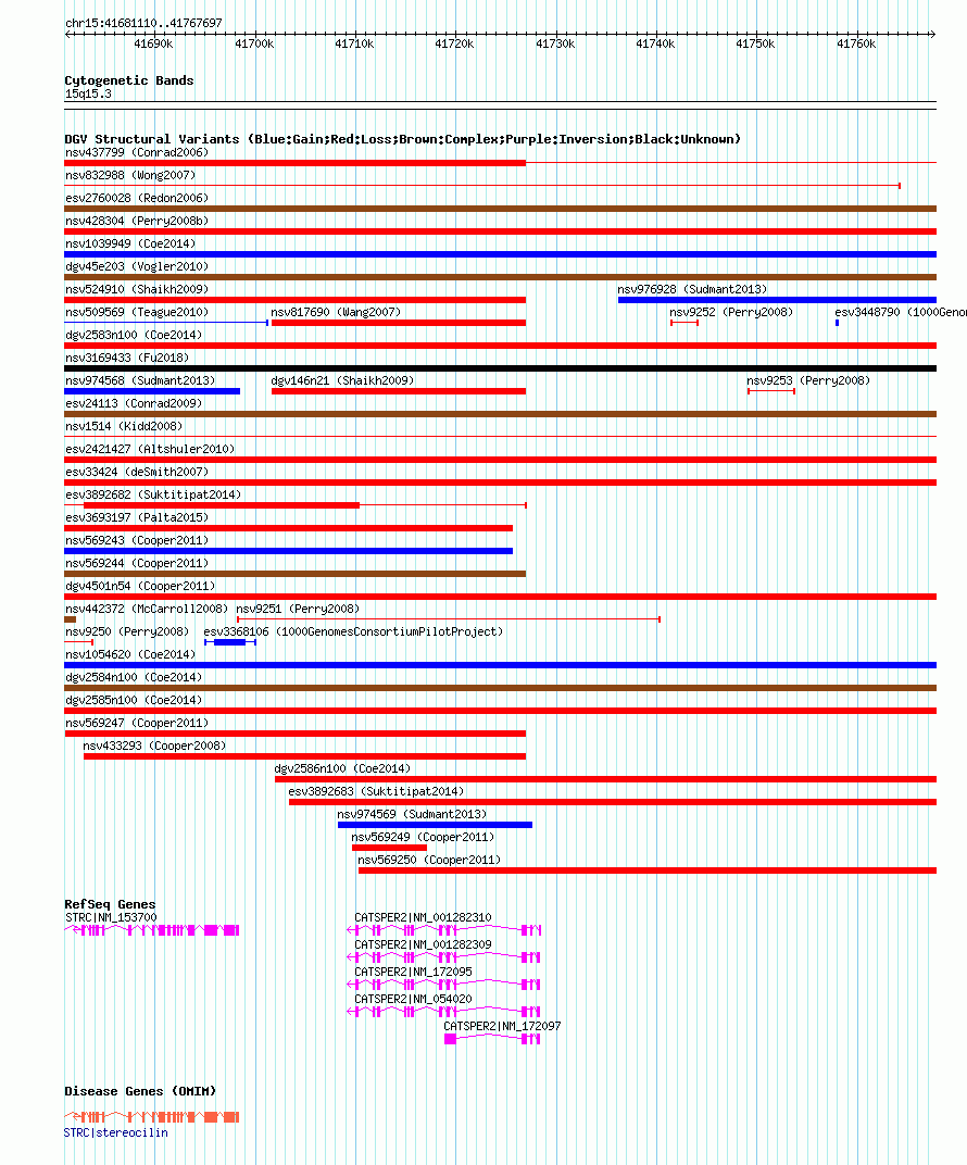 | | Variant Type | CNV loss | | Copy Number | | | Allele State | | | Allele Origin | | | Probe Count | | | Validation Flag | | | Merged Status | M | | Merged Variants | dgv4501n54 | | Supporting Variants | nssv842241 | | Samples | | | Known Genes | CATSPER2, RNU6-28P, STRC | | Method | SNP array | | Analysis | Illumina SNP array copy number analysis | | Platform | Not reported | | Comments | | | Reference | Cooper_et_al_2011 | | Pubmed ID | 21841781 | | Accession Number(s) | nsv569248