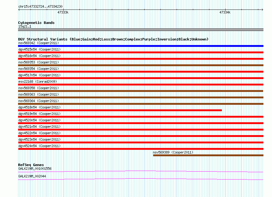 | | Variant Type | CNV loss | | Copy Number | | | Allele State | | | Allele Origin | | | Probe Count | | | Validation Flag | | | Merged Status | M | | Merged Variants | dgv4523n54 | | Supporting Variants | nssv842931, nssv842932 | | Samples | | | Known Genes | GALK2 | | Method | SNP array | | Analysis | Illumina SNP array copy number analysis | | Platform | Not reported | | Comments | | | Reference | Cooper_et_al_2011 | | Pubmed ID | 21841781 | | Accession Number(s) | nsv569376