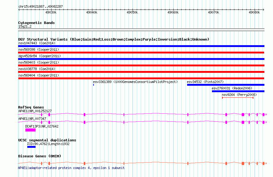 | | Variant Type | CNV loss | | Copy Number | | | Allele State | | | Allele Origin | | | Probe Count | | | Validation Flag | | | Merged Status | M | | Merged Variants | | | Supporting Variants | nssv842979 | | Samples | | | Known Genes | AP4E1, DCAF13P3 | | Method | SNP array | | Analysis | Illumina SNP array copy number analysis | | Platform | Not reported | | Comments | | | Reference | Cooper_et_al_2011 | | Pubmed ID | 21841781 | | Accession Number(s) | nsv569404