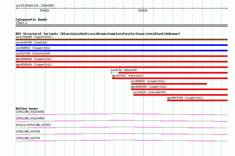 | | Variant Type | CNV loss | | Copy Number | | | Allele State | | | Allele Origin | | | Probe Count | | | Validation Flag | | | Merged Status | M | | Merged Variants | dgv4545n54 | | Supporting Variants | nssv843344 | | Samples | | | Known Genes | CCPG1, DYX1C1-CCPG1 | | Method | SNP array | | Analysis | Illumina SNP array copy number analysis | | Platform | Not reported | | Comments | | | Reference | Cooper_et_al_2011 | | Pubmed ID | 21841781 | | Accession Number(s) | nsv569528
